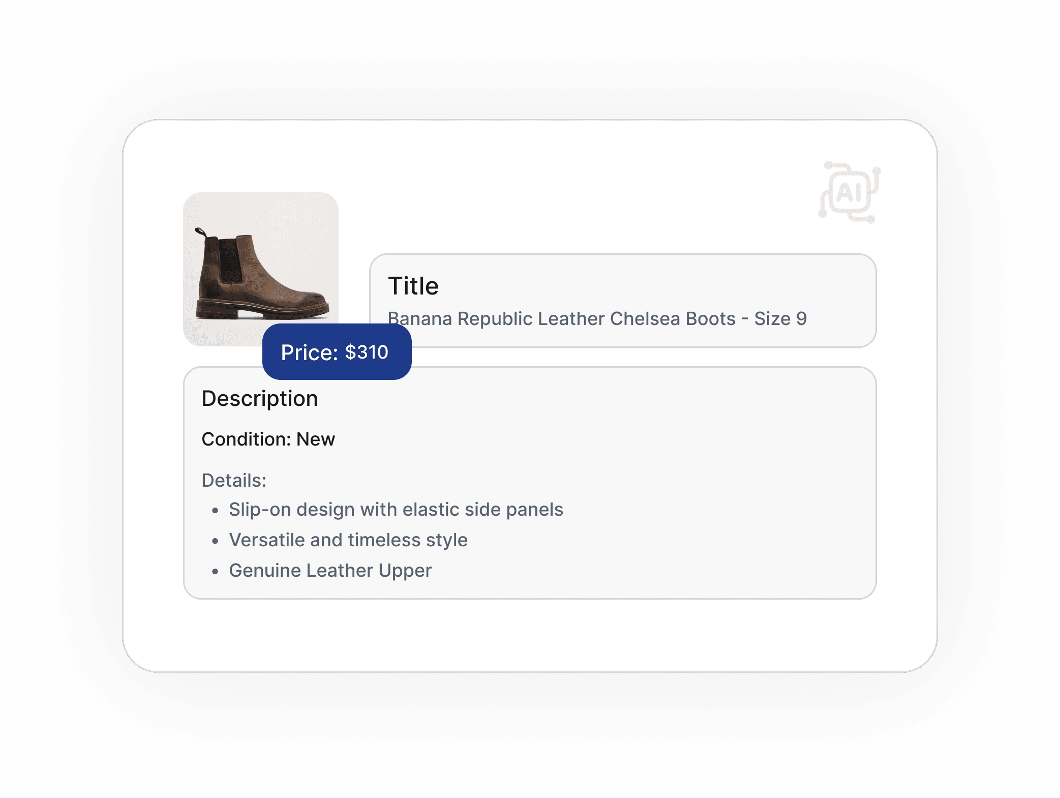 Upload a photo and let AI do the work. Rethread generates optimized titles, descriptions, and tags to help your listings stand out and sell faster.